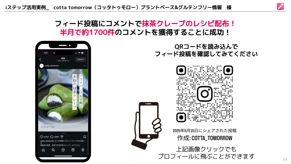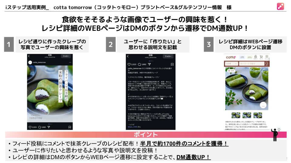 cotta tomorrow様は、Instagramフィード投稿に「抹茶クレープのレシピ配布企画」を導入し、半月で約1,700件のコメントを獲得。その成功を支えたのが、自動DM返信ツール「iステップ」の活用でした。