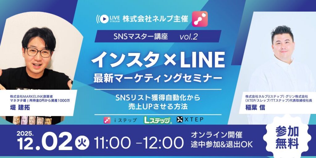 - Instagram×LINEで売上を最大化する“リスト獲得自動化戦略”とは?12/2開催・稲葉信✖️堤建拓コラボセミナー