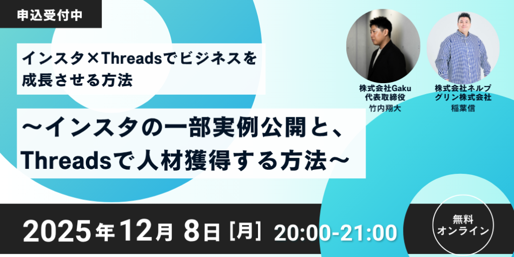 | 12/8(月) | 株式会社Gaku ショーワークス | インスタ×Threadsでビジネスを成長させる方法〜インスタ実例公開とThreadsで人材獲得〜 | 20:00〜21:00 |
