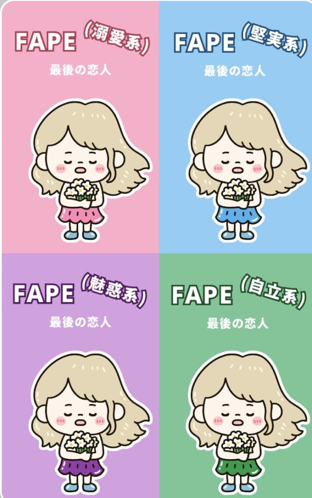 | 最後の恋人(FAPE) あなたはたくさん悲しい思いもしながら、しかし最終的には愛され、多くの人が最後にたどり着く存在であることから『最後の恋人』と言われています。 あなたは常に優しさに溢れていて、最後の恋人は16タイプの中で1番性格がいいラブタイプです。どんな人でも受け入れる心の広さ、包容力を持っていて、別名“令和のマザーテレサ”とも言われています。あなたを捕まえた恋人は幸せと言えるでしょう。 ただ、残念なことにその優しさにつけこんでくる人は一定数います。 | ◎ ボス猫:包容力と情熱で理想の関係 〇 パーフェクトカメレオン:予測不能さで刺激をもらえる 〇 憧れの先輩:安心感のある穏やかな関係 △ 最後の恋人:優しすぎて距離が縮まらない |