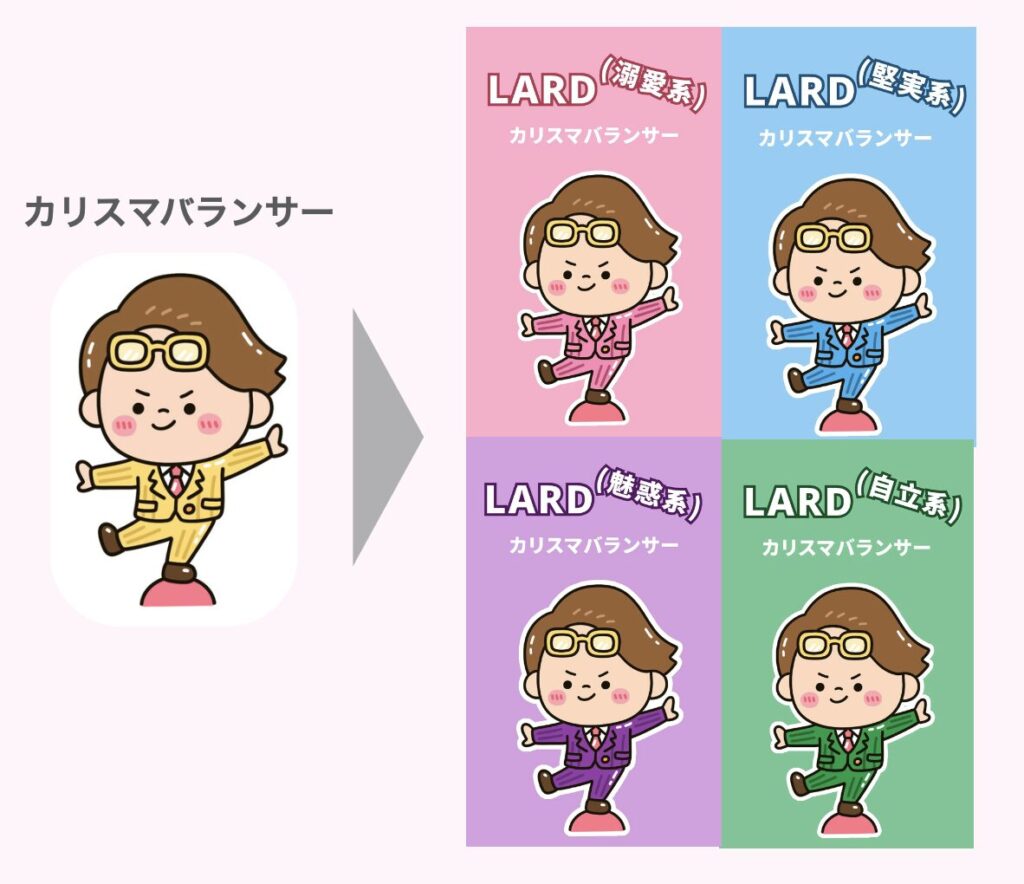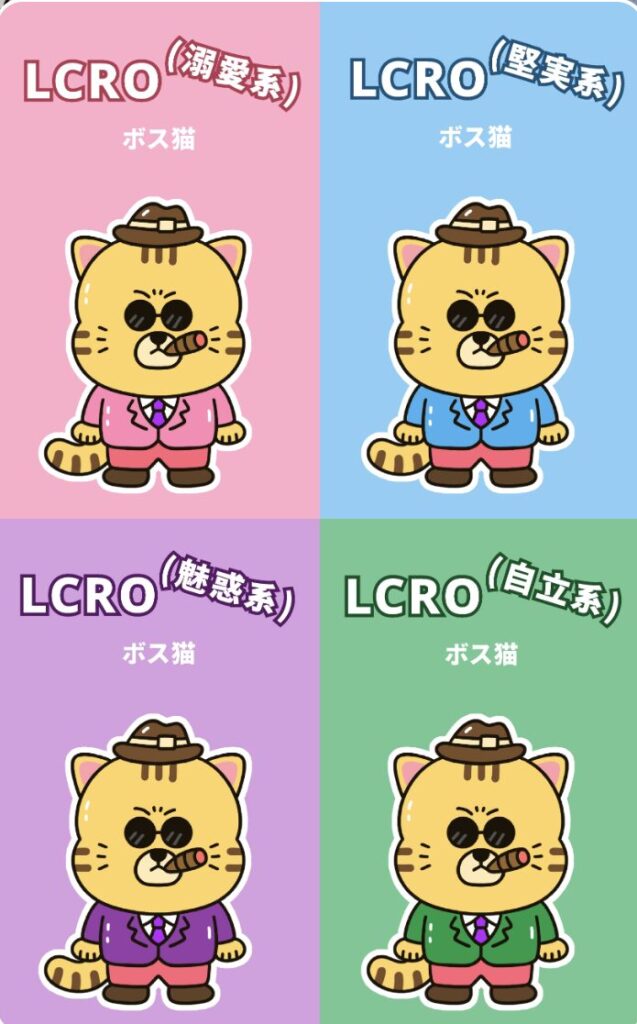 例えば、従来の「忠犬ハチ公」というキャラなら、**「溺愛系忠犬ハチ公」や「堅実系忠犬ハチ公」**のように、「ちゃっかりうさぎ」なら**「魅惑系ちゃっかりうさぎ」や「堅実系ちゃっかりうさぎ」**より具体的な傾向が分かります。