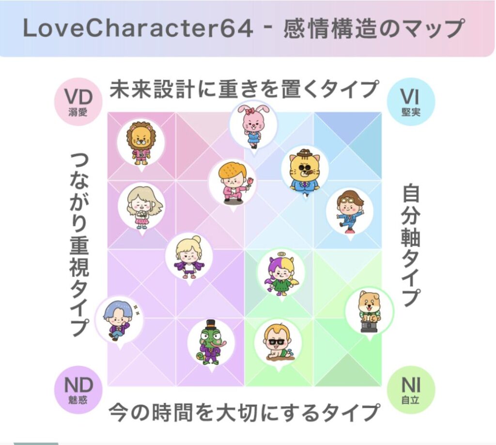 LoveCharacter64 は、恋愛タイプをより深く掘り下げ、合計 64 種類に分類した新しい恋愛診断。