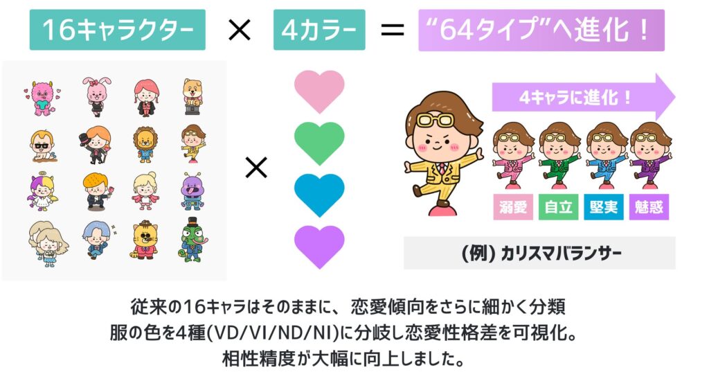 キャラクターを16 分類から 64 分類にすることでより細かく自分や好きな人の恋愛スタイルを把握できる