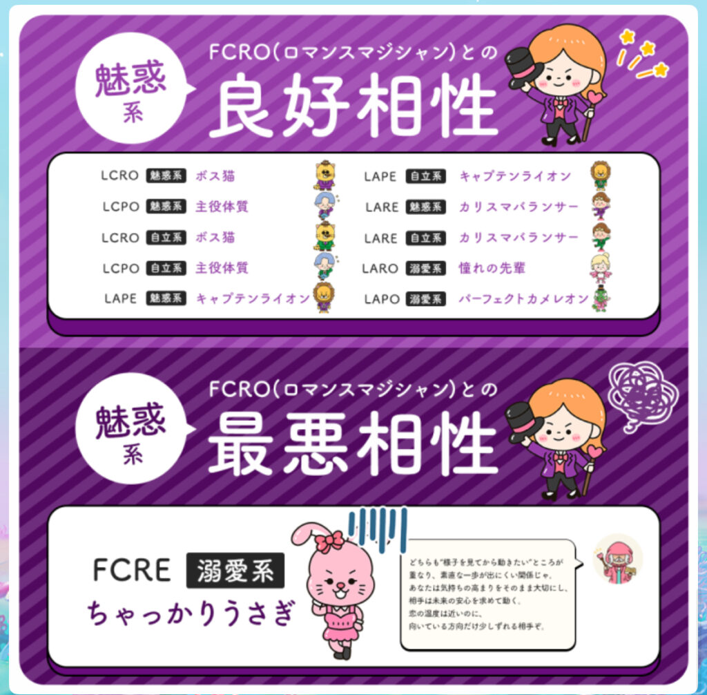 | 堅実系忠犬ハチ公 | 魅惑系ボス猫 | 未来志向のズレ:「堅実系」は信頼と安心感を重視するが、「魅惑系」は刺激や新鮮さを求めるため、相手に飽きさせない努力が必要。 |