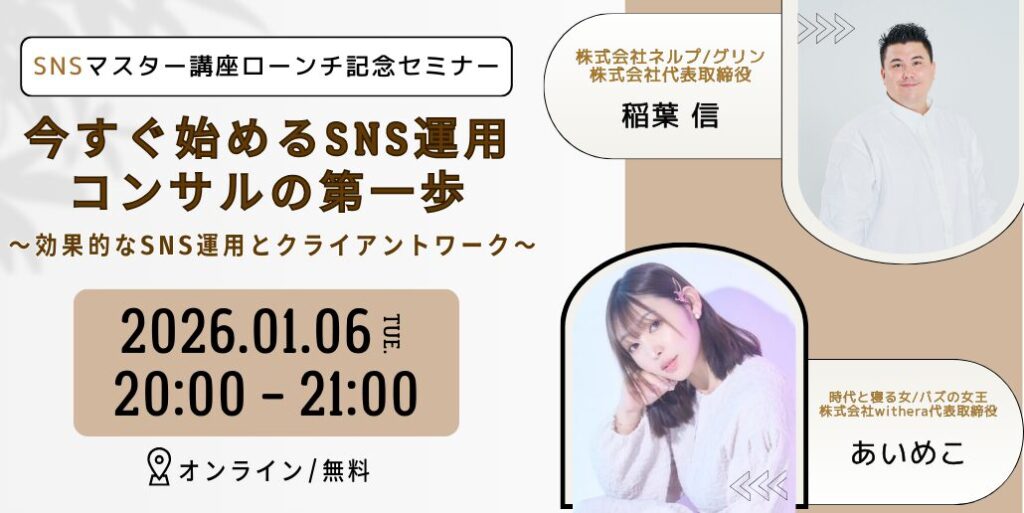- 【SNSコラボセミナー】SNS運用バズらせのプロあいめこ氏が再登壇!1/6開催SNSを仕事にしたい方必見です
