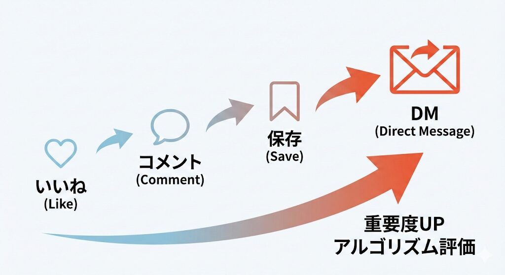 インスタグラムには「いいね」「保存」「コメント」「シェア」など多くのアクションがありますが、2026年現在、アルゴリズム上で最も配点が高い(評価される)のが「DM」です。
